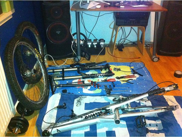 Forgaffel skulle have have service, og bagbremsen skulle udluftes, så hvorfor ikke bare skille den helt ad :D mangler lige krakset og gear, og dæmper manglede lige en kædeskiller da den knækkede..-.-