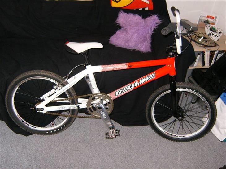 Bombshell gaffel, Røde bombshell hjul, Maxxis Holy roller eller intense, DXR krank, DXR bremser, Et hvidt SLam bar styr og en Thomson X frempind